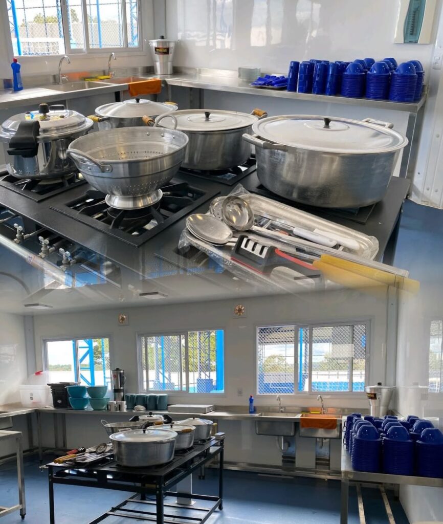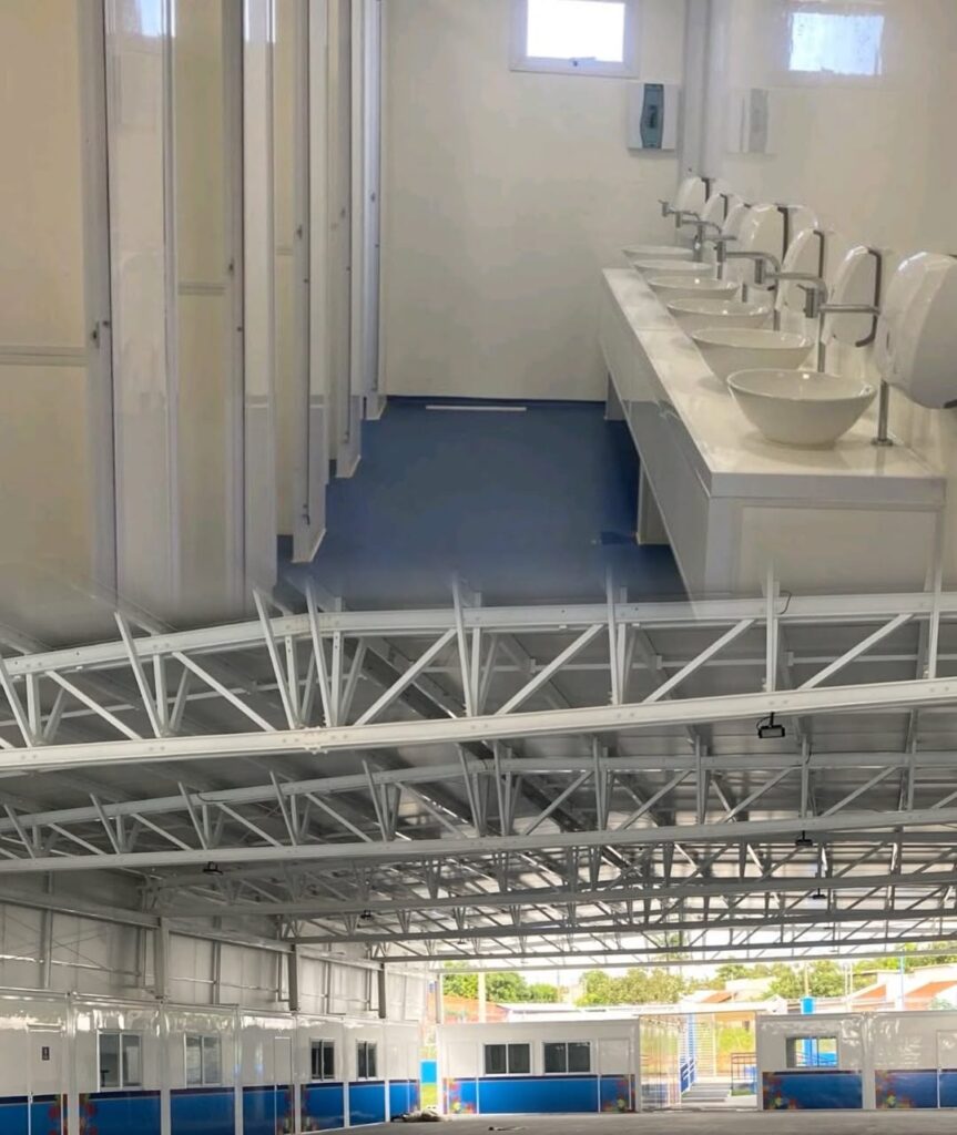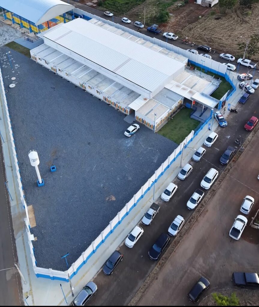O prédio conta com oito módulos, além de muro com gradil metálico, portões de acesso, áreas de convivência, rampa com corrimão, cobertura de interligação entre os blocos, paisagismo com áreas verdes e quadra poliesportiva coberta.